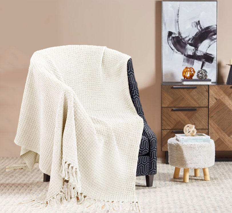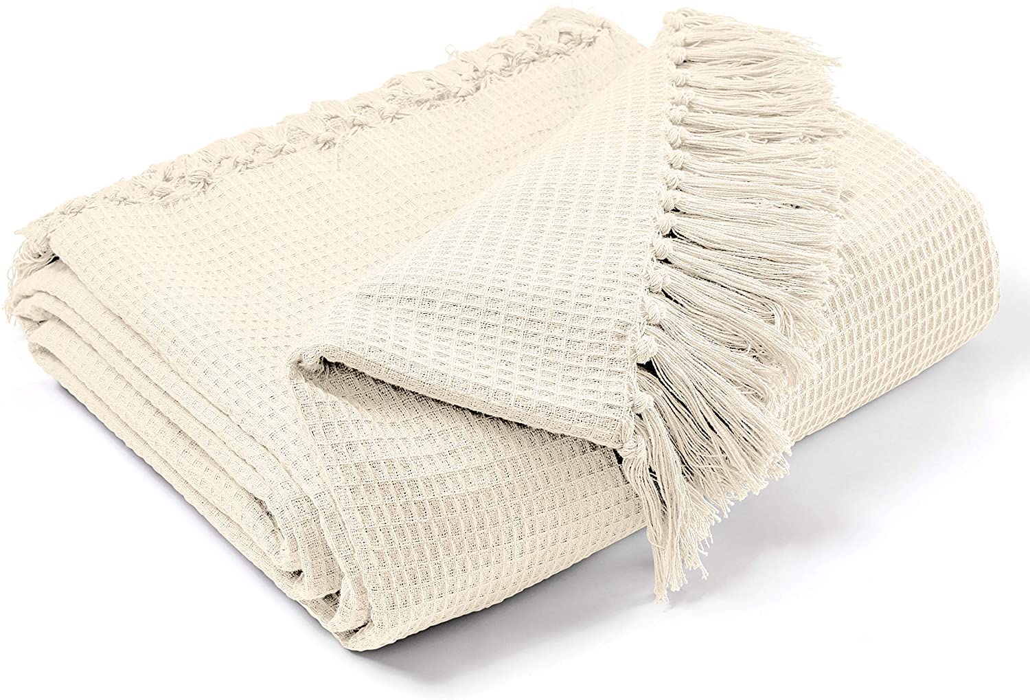 100% Cotton Honeycomb Woven Blanket Throw – Cream