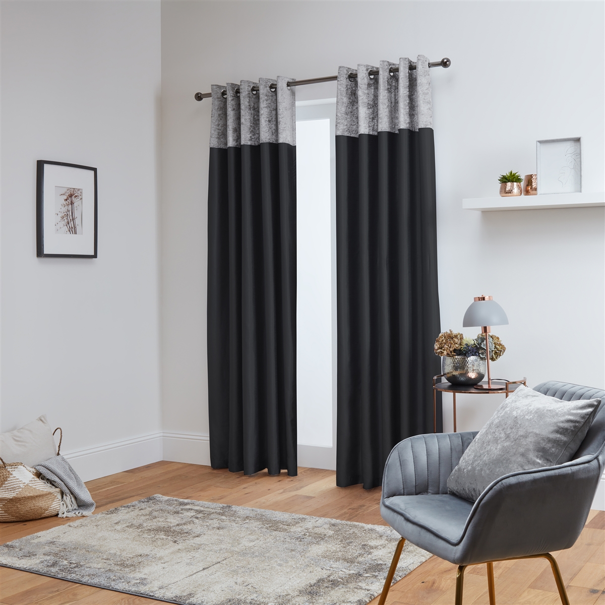 Be the first to review “Black Pair Of Crushed Velvet Band Faux Silk Eyelet Curtains”