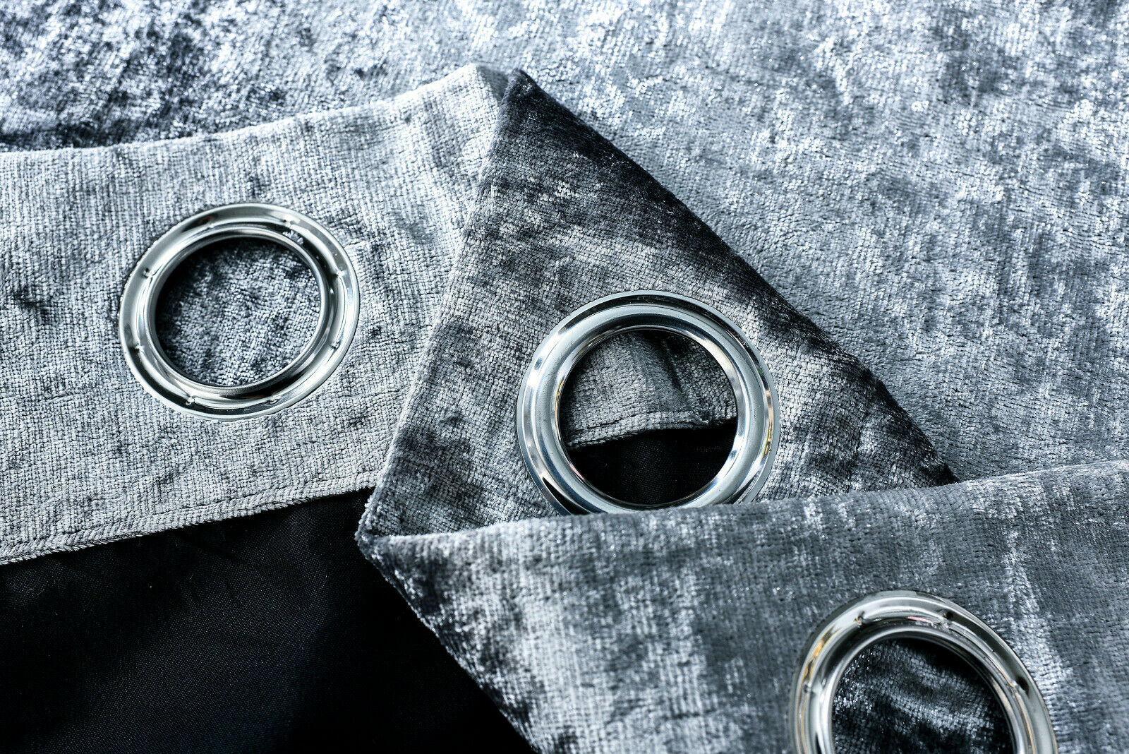 Black Pair Of Crushed Velvet Band Faux Silk Eyelet Curtains