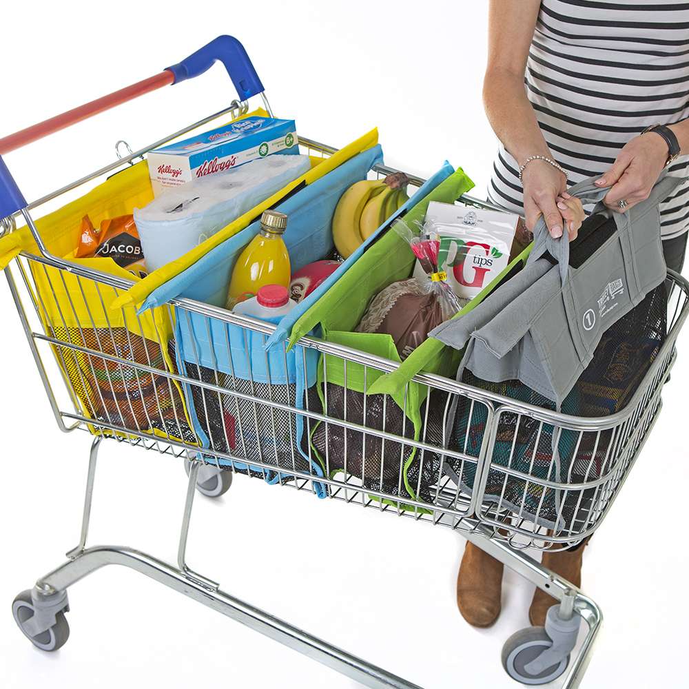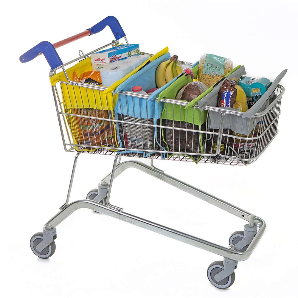 Trolley Bags Express Pastel are a system of four reusable shopping bags that are used to pack your shopping at the supermarket checkout. They are sized smaller than the Original to fit the shallow supermarket trolleys for smaller shops.