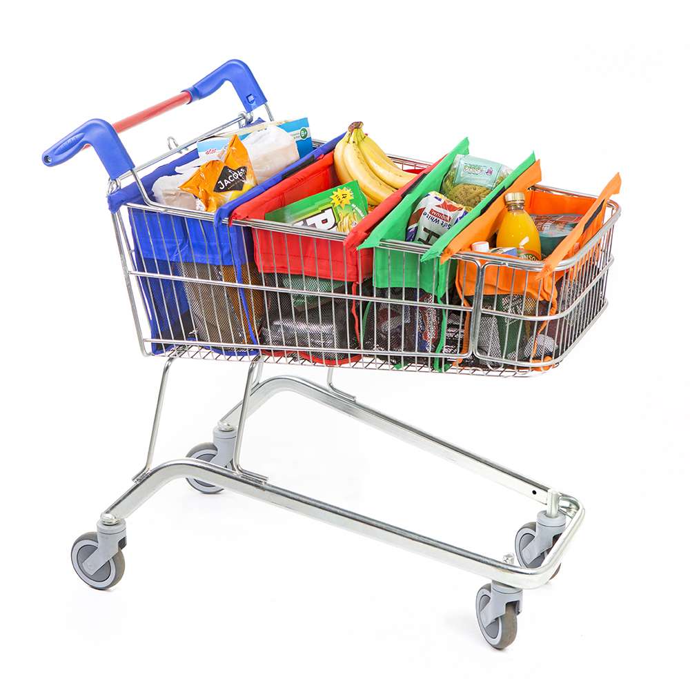 Trolley Bags Express are a system of four reusable shopping bags that are used to pack your shopping at the supermarket checkout. They are sized smaller than the Original to fit the shallow supermarket trolleys for smaller shops.