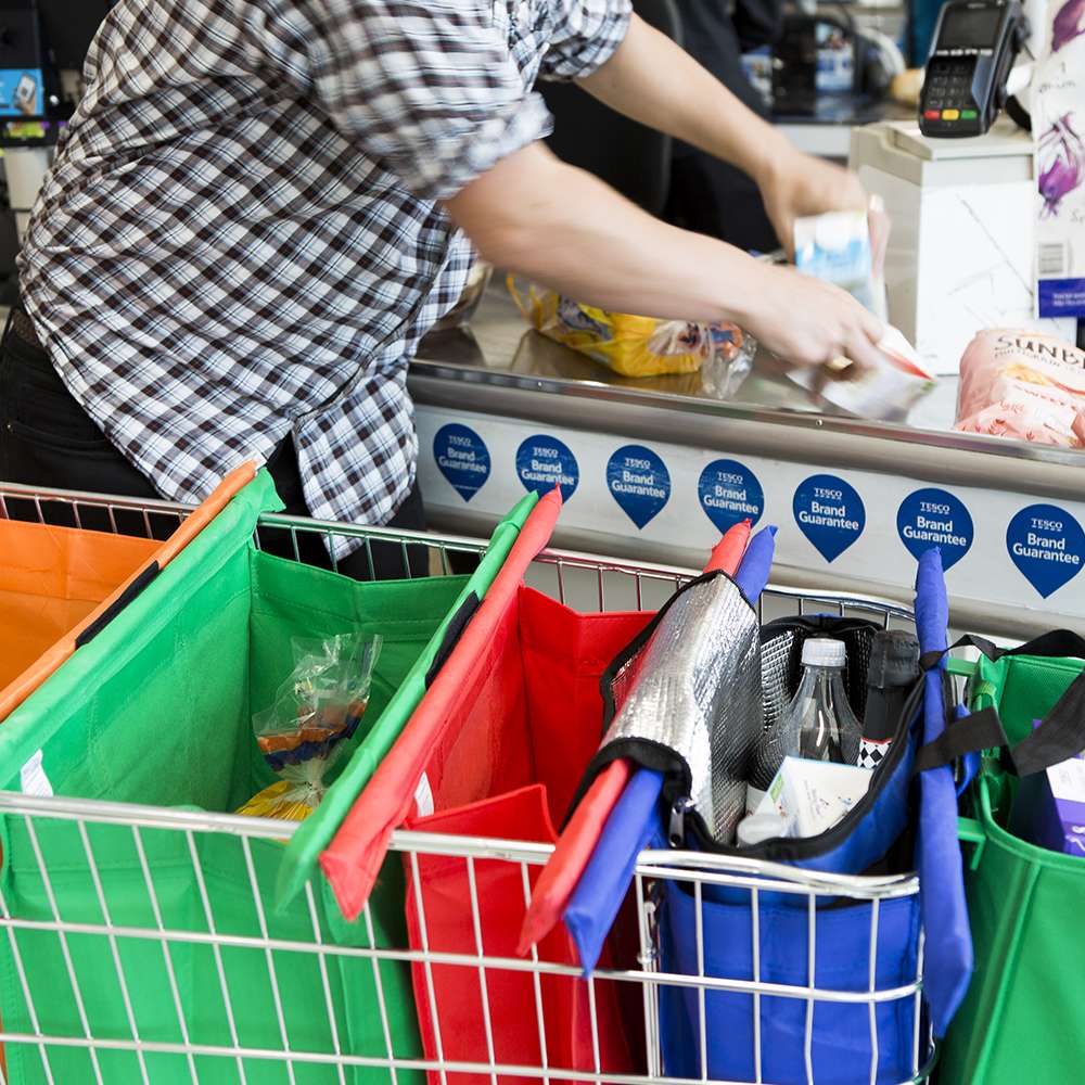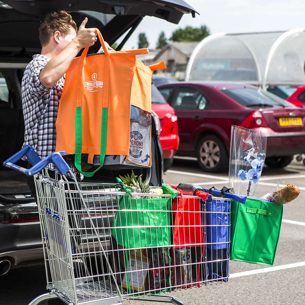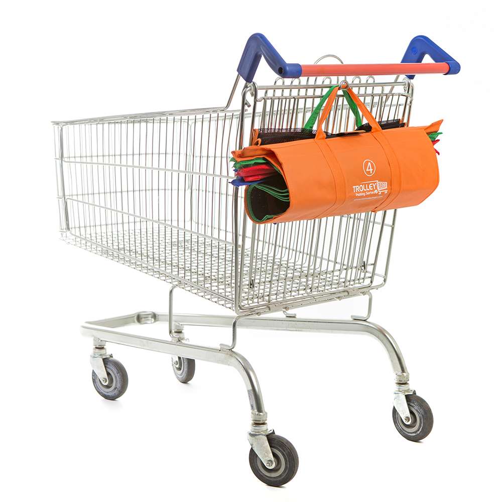 Trolley Bags Original are a system of four reusable shopping bags that are used to pack your shopping at the supermarket checkout. The Original set are the ideal size to fit the large, deep trolleys for the big weekly shop.